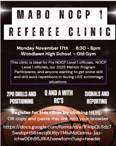 NOCP 1 On Court Clinic - Monday November 17th * 6:30 - 8pm Woodlawn High School * Old Gym